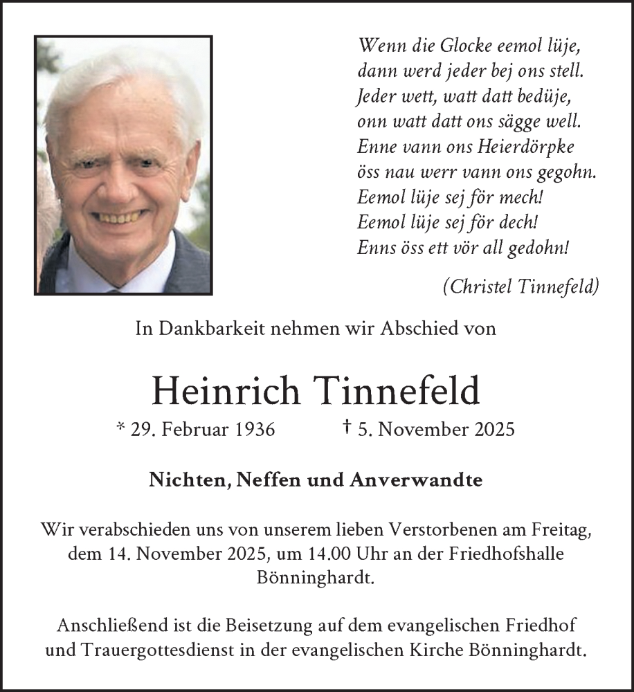 Hier finden Sie alle Traueranzeigen aus der Zeitung, die bisher für Heinrich Tinnefeld erschienen sind. Weitere Traueranzeigen, die in der Zeitung erscheinen, werden hier ebenfalls aufgelistet