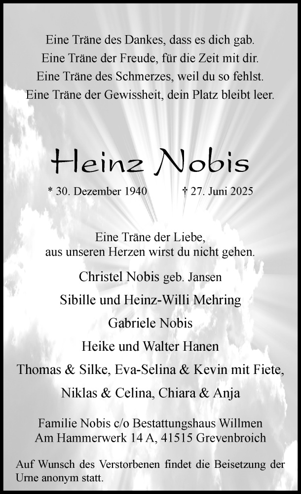 Hier finden Sie alle Traueranzeigen aus der Zeitung, die bisher für Heinz Nobis erschienen sind. Weitere Traueranzeigen, die in der Zeitung erscheinen, werden hier ebenfalls aufgelistet
