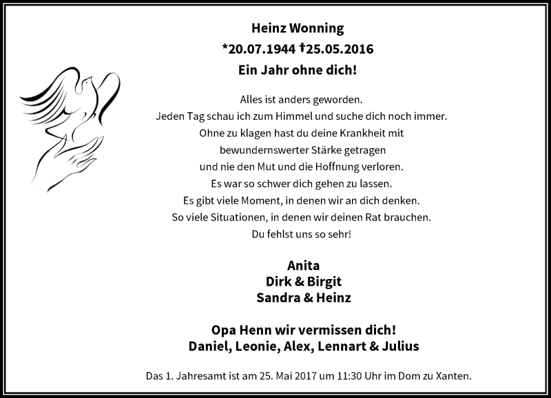 Hier finden Sie alle Traueranzeigen aus der Zeitung, die bisher für Heinz Wonning erschienen sind. Weitere Traueranzeigen, die in der Zeitung erscheinen, werden hier ebenfalls aufgelistet