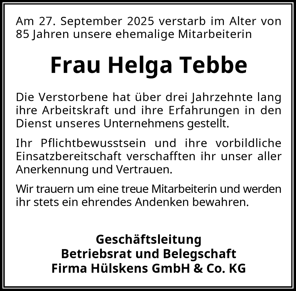 Hier finden Sie alle Traueranzeigen aus der Zeitung, die bisher für Helga Tebbe erschienen sind. Weitere Traueranzeigen, die in der Zeitung erscheinen, werden hier ebenfalls aufgelistet