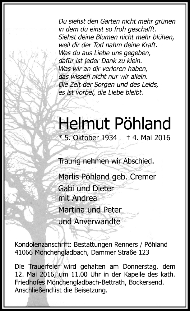Hier finden Sie alle Traueranzeigen aus der Zeitung, die bisher für Helmut Pöhland erschienen sind. Weitere Traueranzeigen, die in der Zeitung erscheinen, werden hier ebenfalls aufgelistet