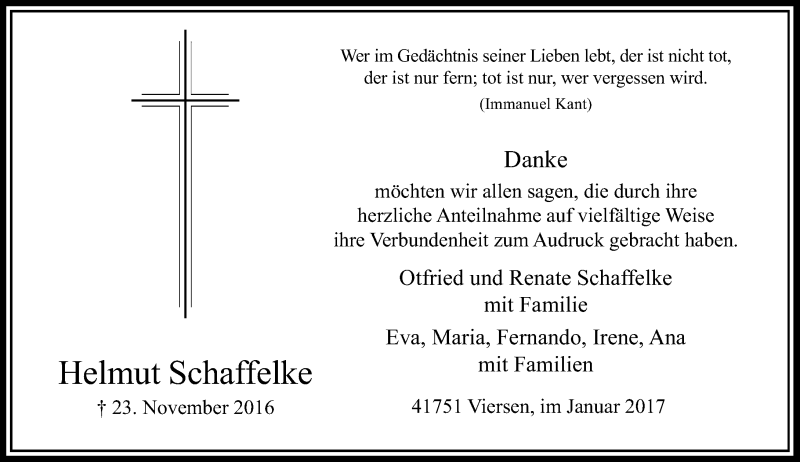 Hier finden Sie alle Traueranzeigen aus der Zeitung, die bisher für Helmut Schaffelke erschienen sind. Weitere Traueranzeigen, die in der Zeitung erscheinen, werden hier ebenfalls aufgelistet
