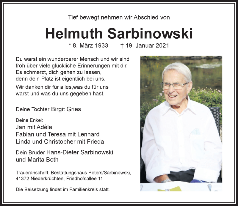 Hier finden Sie alle Traueranzeigen aus der Zeitung, die bisher für Helmuth Sarbinowski erschienen sind. Weitere Traueranzeigen, die in der Zeitung erscheinen, werden hier ebenfalls aufgelistet