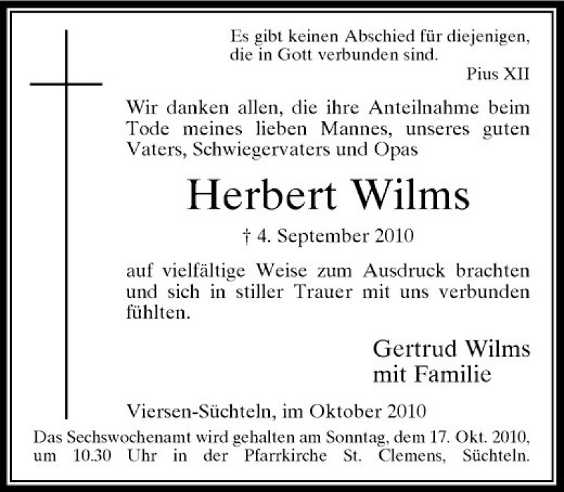 Hier finden Sie alle Traueranzeigen aus der Zeitung, die bisher für Herbert Wilms erschienen sind. Weitere Traueranzeigen, die in der Zeitung erscheinen, werden hier ebenfalls aufgelistet