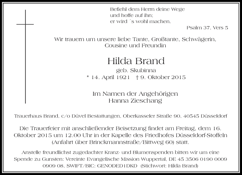 Hier finden Sie alle Traueranzeigen aus der Zeitung, die bisher für Hilda Brand erschienen sind. Weitere Traueranzeigen, die in der Zeitung erscheinen, werden hier ebenfalls aufgelistet