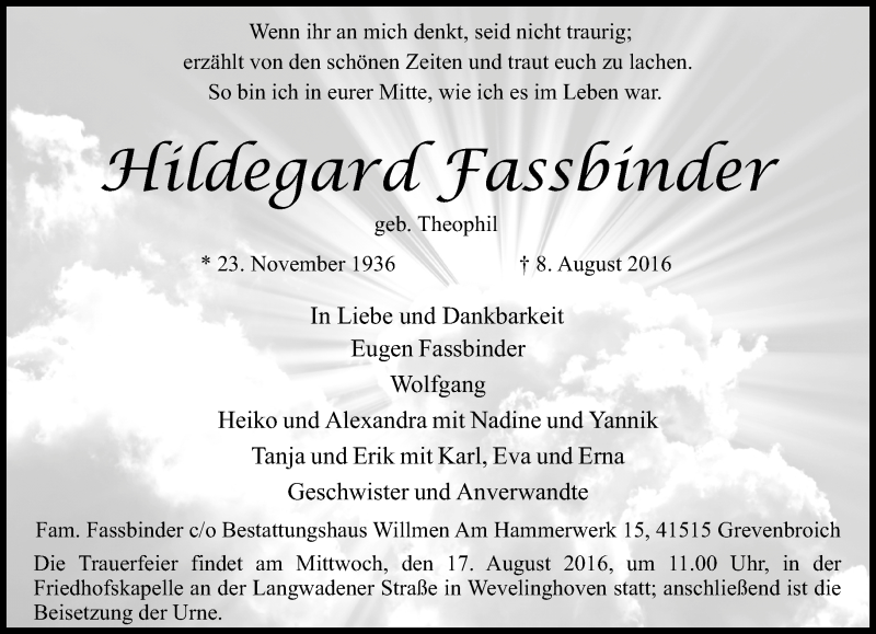 Hier finden Sie alle Traueranzeigen aus der Zeitung, die bisher für Hildegard Fassbinder erschienen sind. Weitere Traueranzeigen, die in der Zeitung erscheinen, werden hier ebenfalls aufgelistet