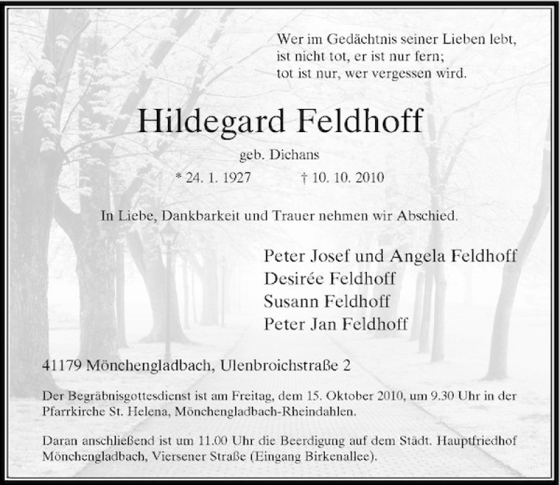 Hier finden Sie alle Traueranzeigen aus der Zeitung, die bisher für Hildegard Feldhoff erschienen sind. Weitere Traueranzeigen, die in der Zeitung erscheinen, werden hier ebenfalls aufgelistet