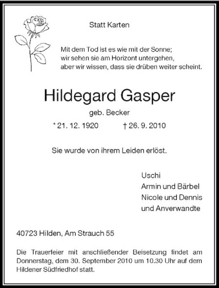 Hier finden Sie alle Traueranzeigen aus der Zeitung, die bisher für Hildegard Gasper erschienen sind. Weitere Traueranzeigen, die in der Zeitung erscheinen, werden hier ebenfalls aufgelistet