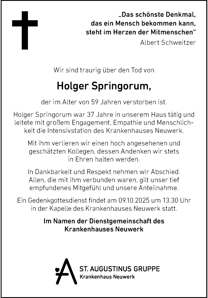 Hier finden Sie alle Traueranzeigen aus der Zeitung, die bisher für Holger Springorum erschienen sind. Weitere Traueranzeigen, die in der Zeitung erscheinen, werden hier ebenfalls aufgelistet