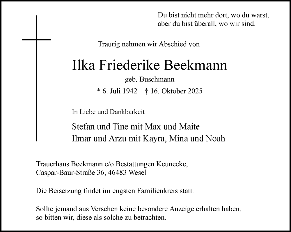 Hier finden Sie alle Traueranzeigen aus der Zeitung, die bisher für Ilka Friederike Beekmann erschienen sind. Weitere Traueranzeigen, die in der Zeitung erscheinen, werden hier ebenfalls aufgelistet