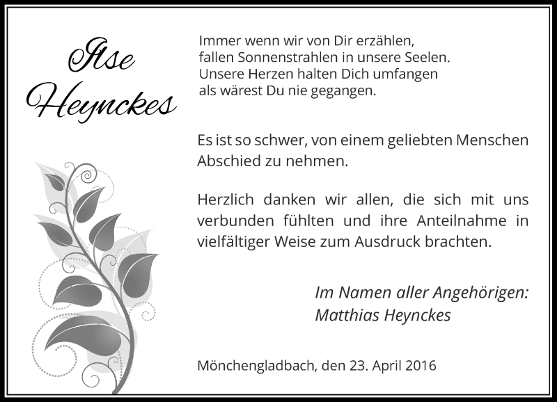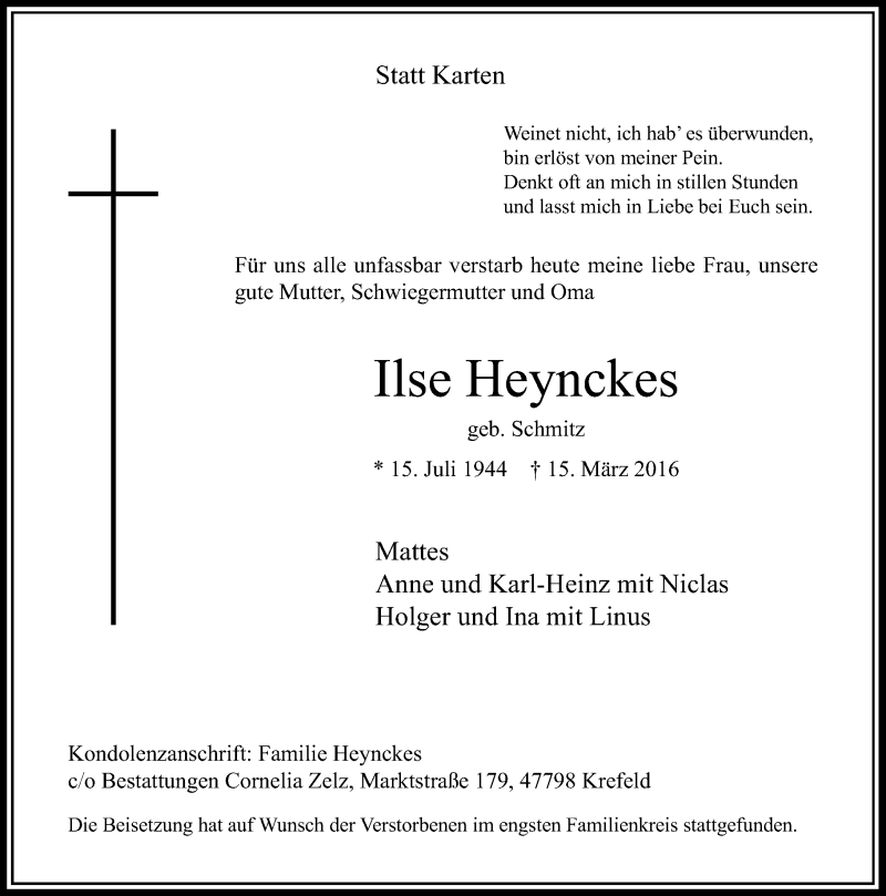 Hier finden Sie alle Traueranzeigen aus der Zeitung, die bisher für Ilse Heynckes erschienen sind. Weitere Traueranzeigen, die in der Zeitung erscheinen, werden hier ebenfalls aufgelistet
