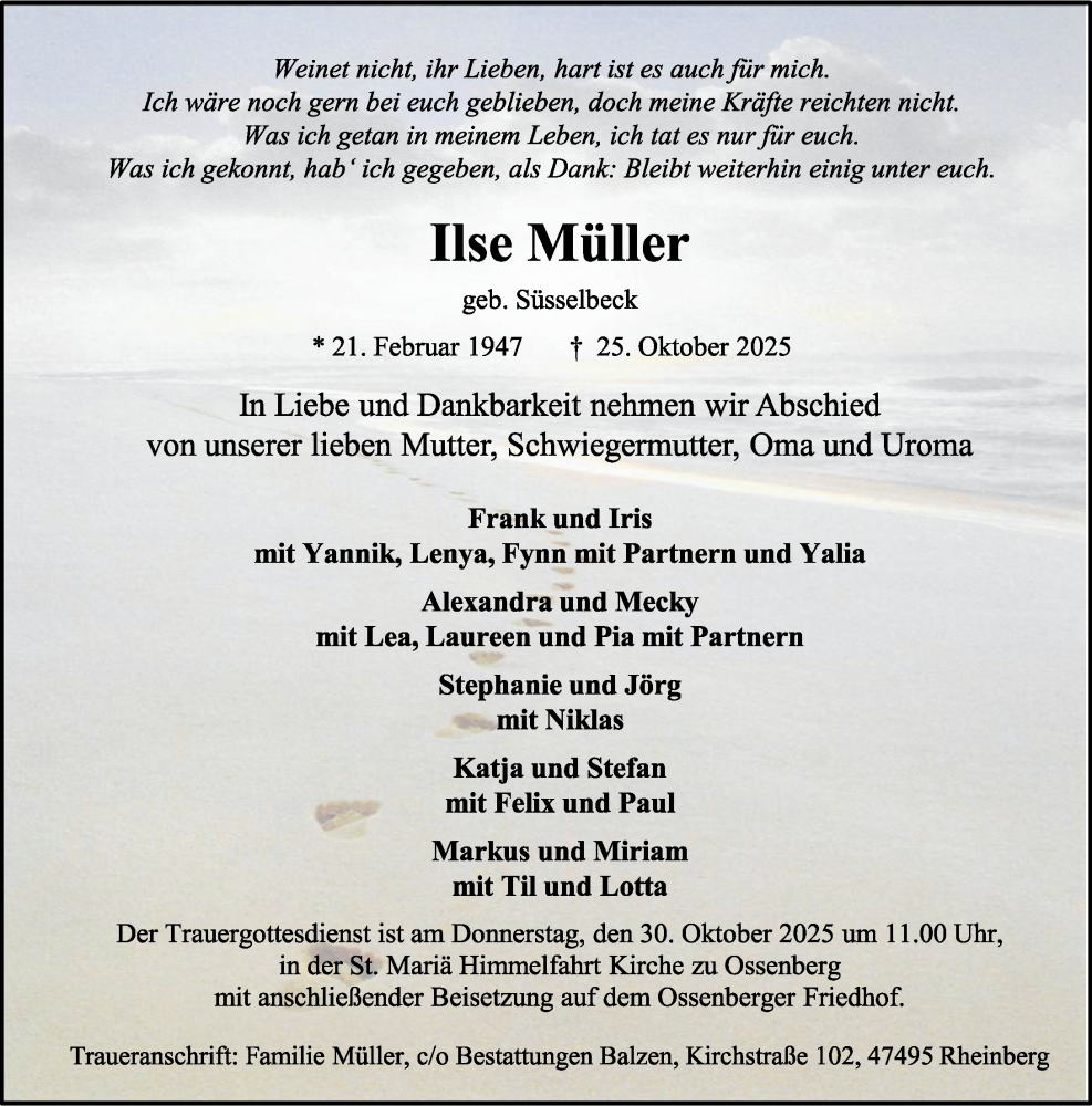 Hier finden Sie alle Traueranzeigen aus der Zeitung, die bisher für Ilse Müller erschienen sind. Weitere Traueranzeigen, die in der Zeitung erscheinen, werden hier ebenfalls aufgelistet