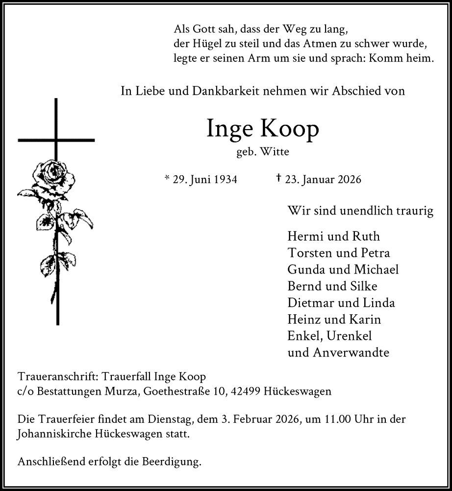 Hier finden Sie alle Traueranzeigen aus der Zeitung, die bisher für Inge Koop erschienen sind. Weitere Traueranzeigen, die in der Zeitung erscheinen, werden hier ebenfalls aufgelistet