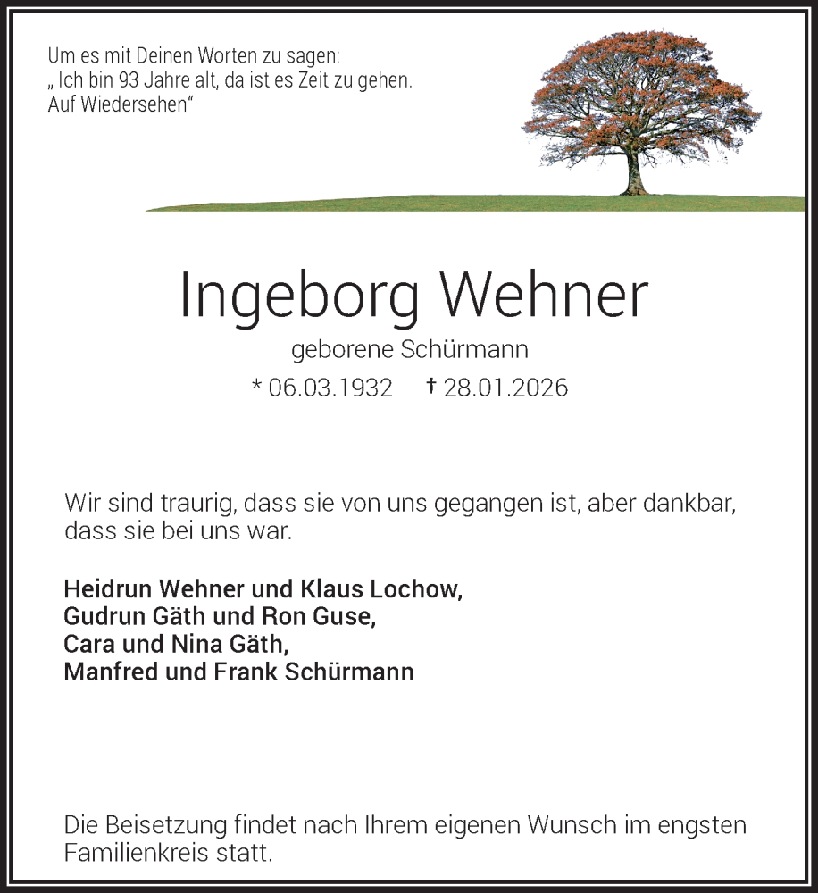 Hier finden Sie alle Traueranzeigen aus der Zeitung, die bisher für Ingeborg Wehner erschienen sind. Weitere Traueranzeigen, die in der Zeitung erscheinen, werden hier ebenfalls aufgelistet