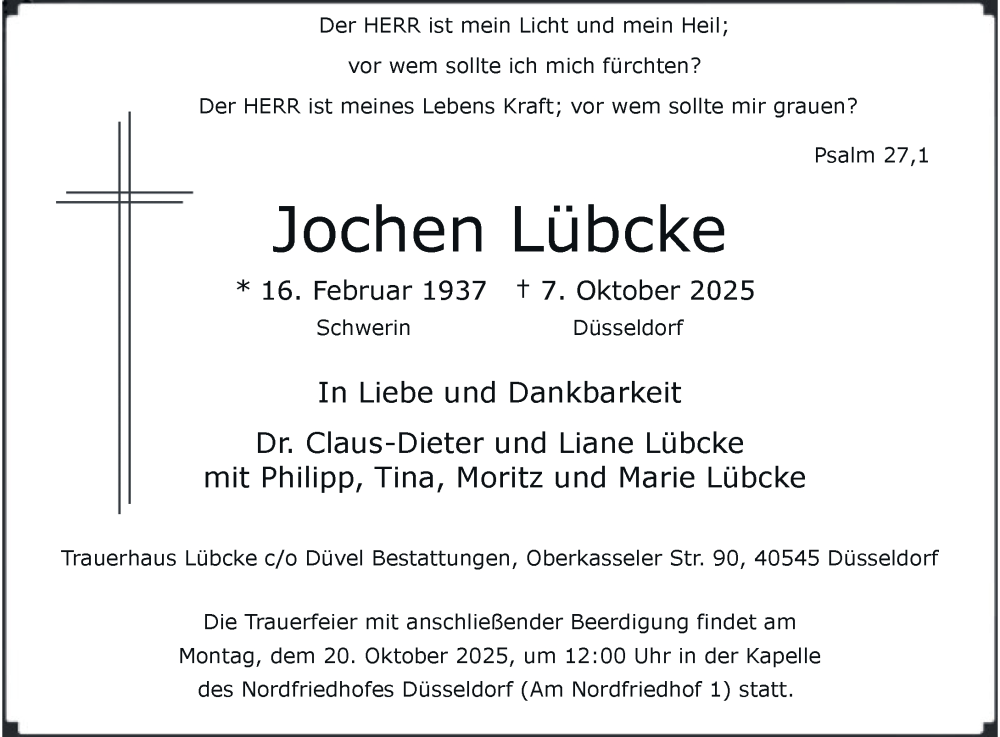 Hier finden Sie alle Traueranzeigen aus der Zeitung, die bisher für Jochen Lübcke erschienen sind. Weitere Traueranzeigen, die in der Zeitung erscheinen, werden hier ebenfalls aufgelistet