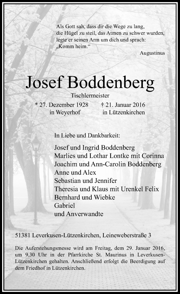 Hier finden Sie alle Traueranzeigen aus der Zeitung, die bisher für Josef Boddenberg erschienen sind. Weitere Traueranzeigen, die in der Zeitung erscheinen, werden hier ebenfalls aufgelistet