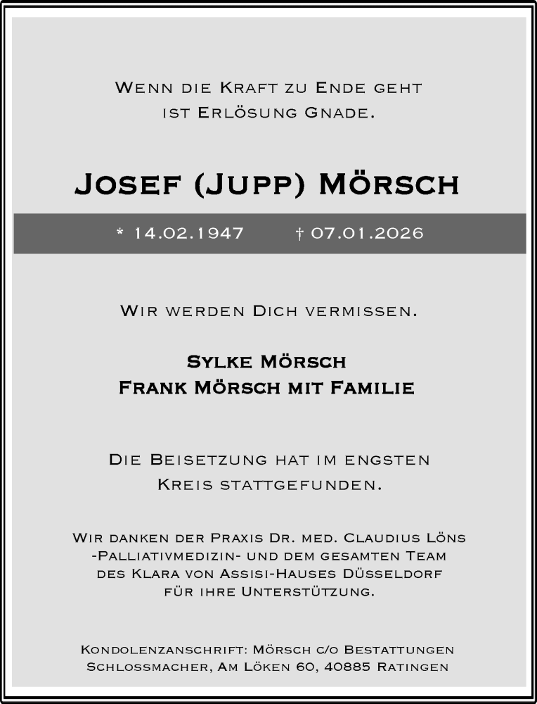 Hier finden Sie alle Traueranzeigen aus der Zeitung, die bisher für Josef Mörsch erschienen sind. Weitere Traueranzeigen, die in der Zeitung erscheinen, werden hier ebenfalls aufgelistet