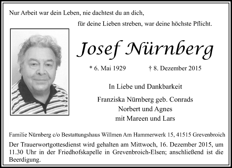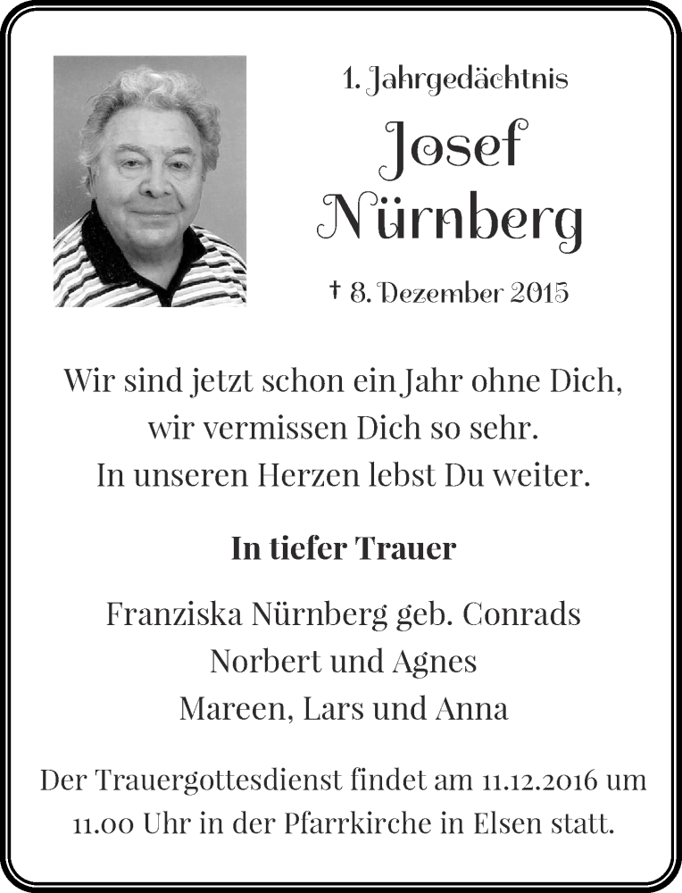 Hier finden Sie alle Traueranzeigen aus der Zeitung, die bisher für Josef Nürnberg erschienen sind. Weitere Traueranzeigen, die in der Zeitung erscheinen, werden hier ebenfalls aufgelistet