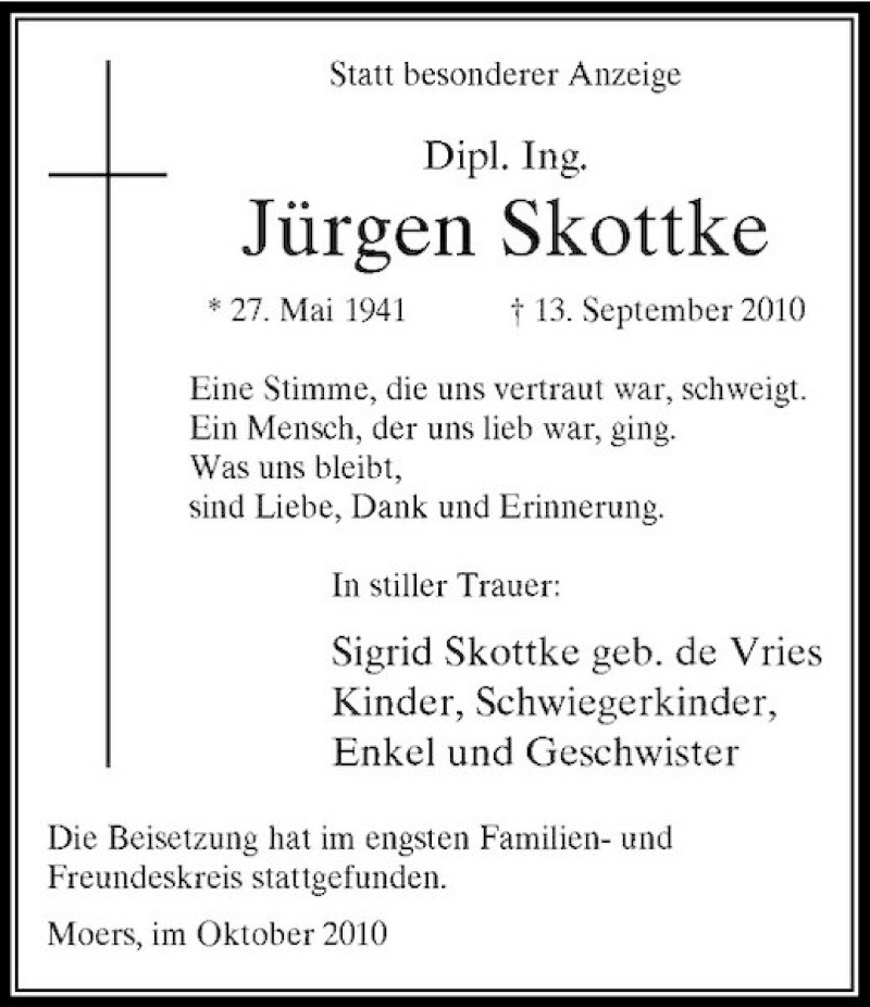 Hier finden Sie alle Traueranzeigen aus der Zeitung, die bisher für Jürgen Skottke erschienen sind. Weitere Traueranzeigen, die in der Zeitung erscheinen, werden hier ebenfalls aufgelistet