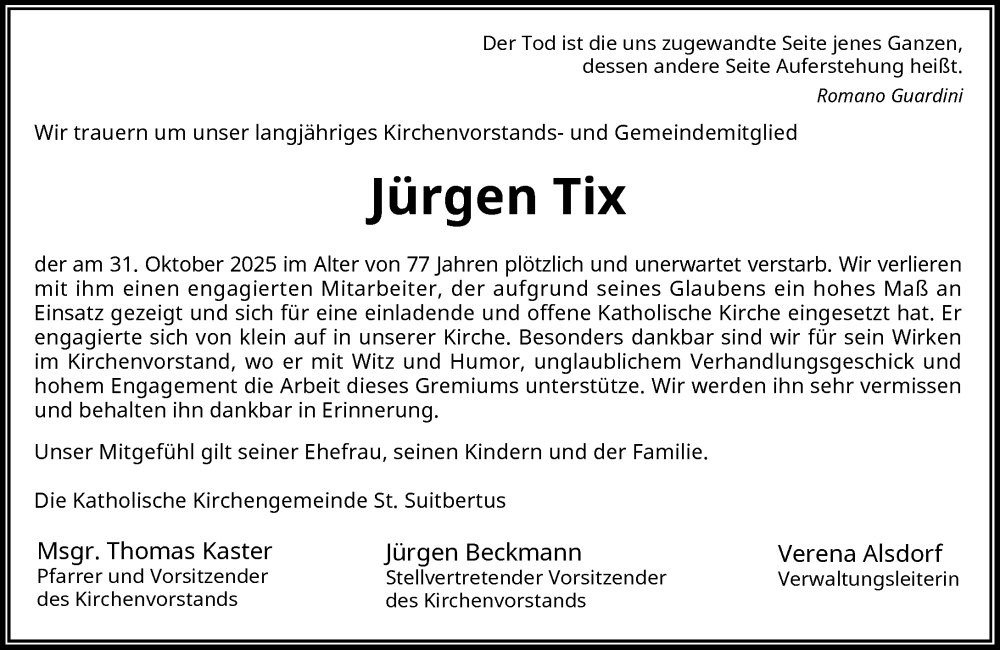Hier finden Sie alle Traueranzeigen aus der Zeitung, die bisher für Jürgen Tix erschienen sind. Weitere Traueranzeigen, die in der Zeitung erscheinen, werden hier ebenfalls aufgelistet