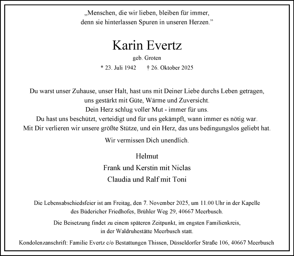 Hier finden Sie alle Traueranzeigen aus der Zeitung, die bisher für Karin Evertz erschienen sind. Weitere Traueranzeigen, die in der Zeitung erscheinen, werden hier ebenfalls aufgelistet