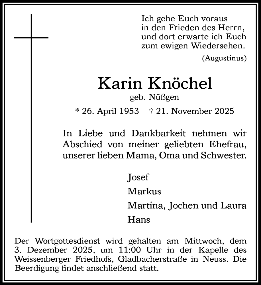Hier finden Sie alle Traueranzeigen aus der Zeitung, die bisher für Karin Knöchel erschienen sind. Weitere Traueranzeigen, die in der Zeitung erscheinen, werden hier ebenfalls aufgelistet