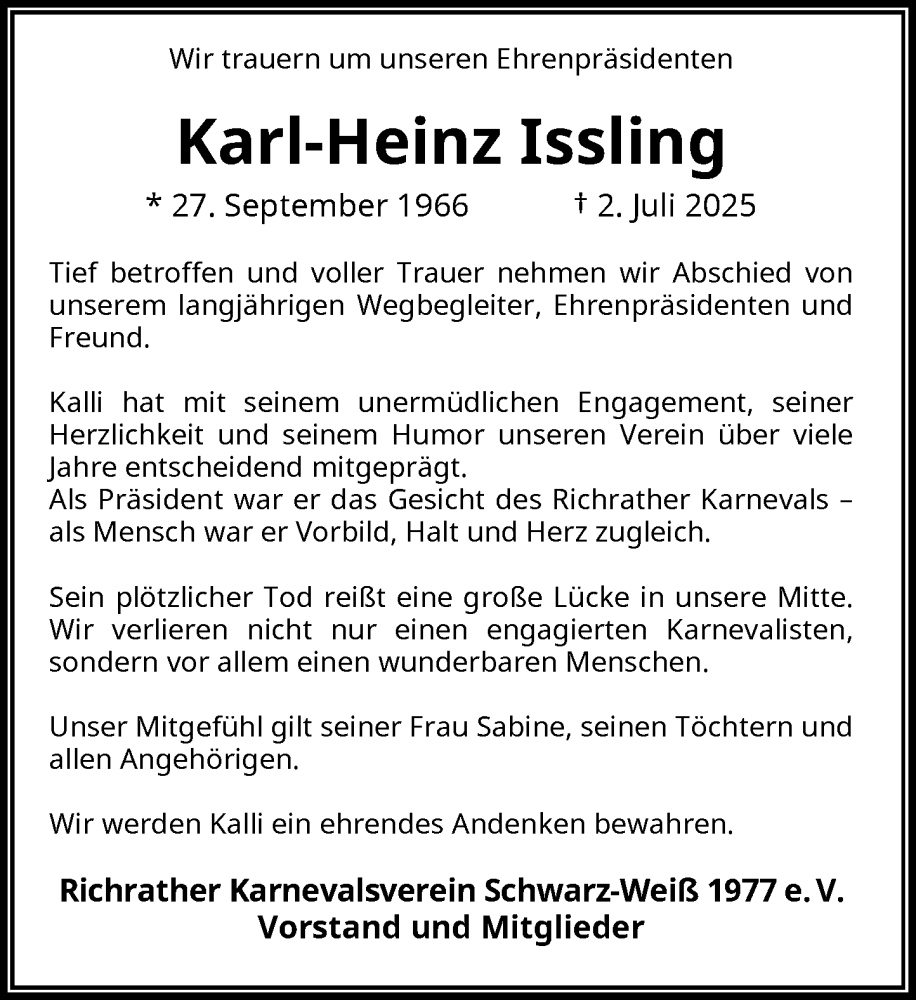 Hier finden Sie alle Traueranzeigen aus der Zeitung, die bisher für Karl-Heinz Ißling erschienen sind. Weitere Traueranzeigen, die in der Zeitung erscheinen, werden hier ebenfalls aufgelistet