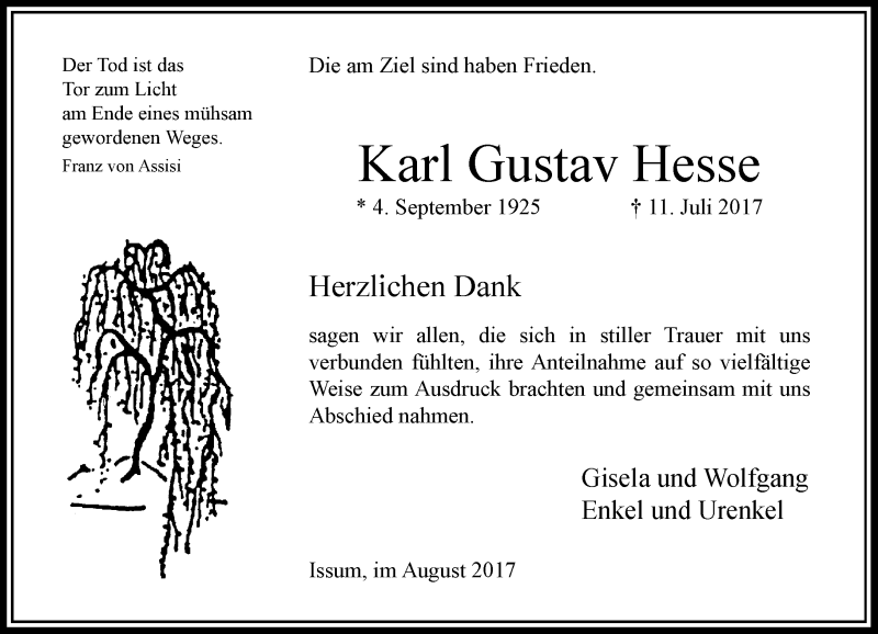 Hier finden Sie alle Traueranzeigen aus der Zeitung, die bisher für Karl Gustav Hesse erschienen sind. Weitere Traueranzeigen, die in der Zeitung erscheinen, werden hier ebenfalls aufgelistet