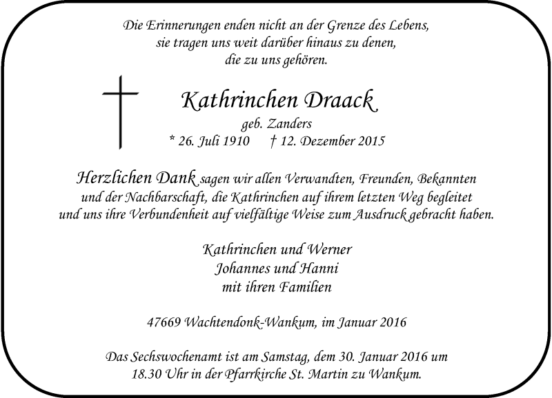 Hier finden Sie alle Traueranzeigen aus der Zeitung, die bisher für Kathrinchen Draack erschienen sind. Weitere Traueranzeigen, die in der Zeitung erscheinen, werden hier ebenfalls aufgelistet