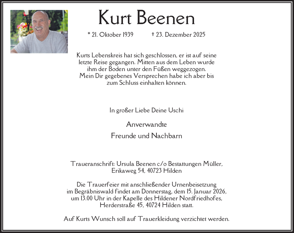 Hier finden Sie alle Traueranzeigen aus der Zeitung, die bisher für Kurt Beenen erschienen sind. Weitere Traueranzeigen, die in der Zeitung erscheinen, werden hier ebenfalls aufgelistet