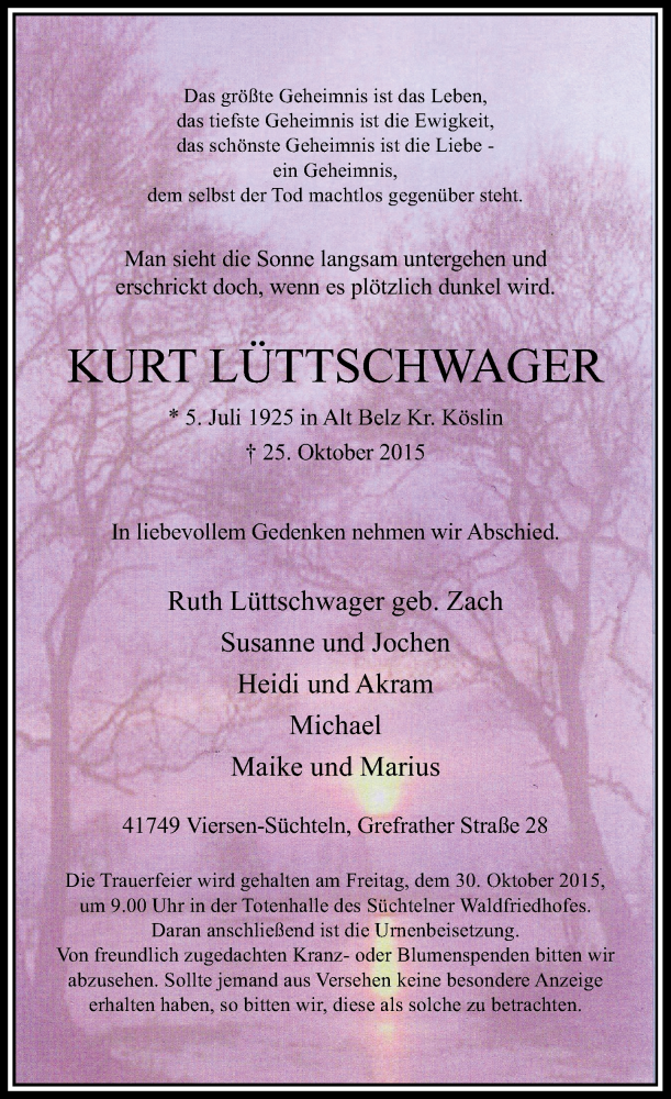 Hier finden Sie alle Traueranzeigen aus der Zeitung, die bisher für Kurt Lüttschwager erschienen sind. Weitere Traueranzeigen, die in der Zeitung erscheinen, werden hier ebenfalls aufgelistet