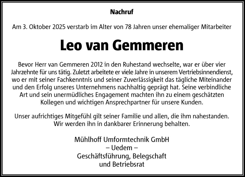 Hier finden Sie alle Traueranzeigen aus der Zeitung, die bisher für Leo van Gemmeren erschienen sind. Weitere Traueranzeigen, die in der Zeitung erscheinen, werden hier ebenfalls aufgelistet