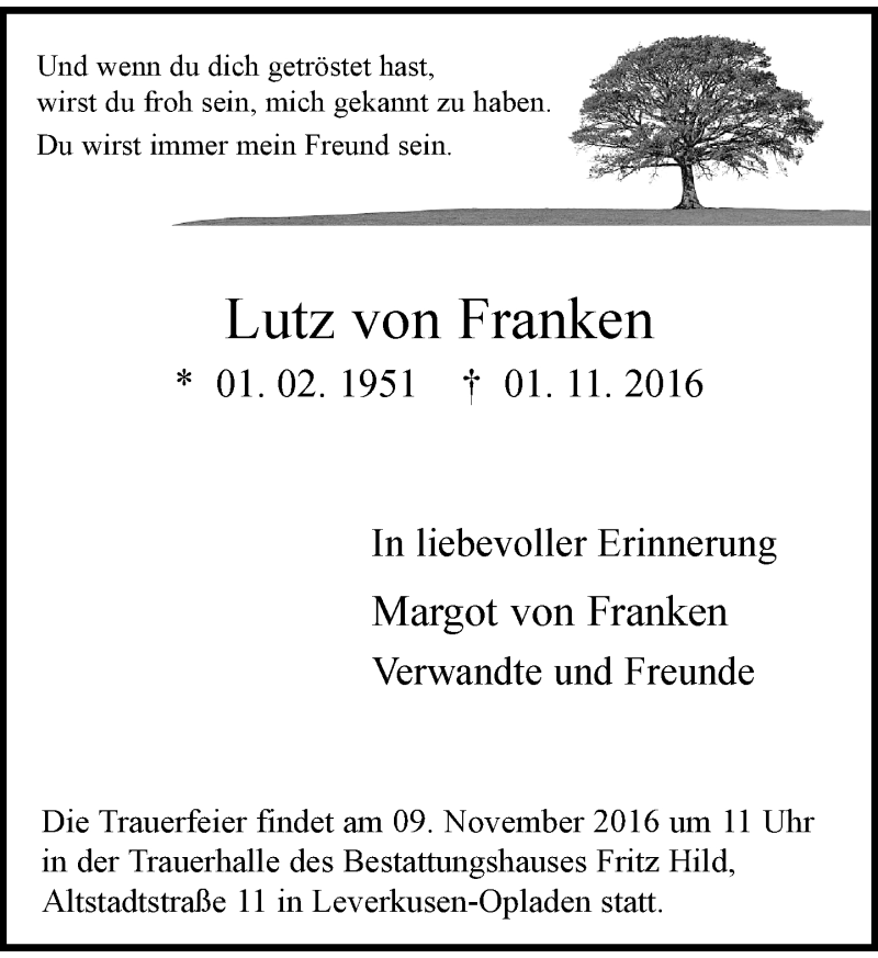 Hier finden Sie alle Traueranzeigen aus der Zeitung, die bisher für Lutz von Franken erschienen sind. Weitere Traueranzeigen, die in der Zeitung erscheinen, werden hier ebenfalls aufgelistet