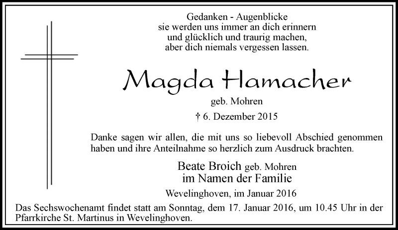 Hier finden Sie alle Traueranzeigen aus der Zeitung, die bisher für Magda Hamacher erschienen sind. Weitere Traueranzeigen, die in der Zeitung erscheinen, werden hier ebenfalls aufgelistet