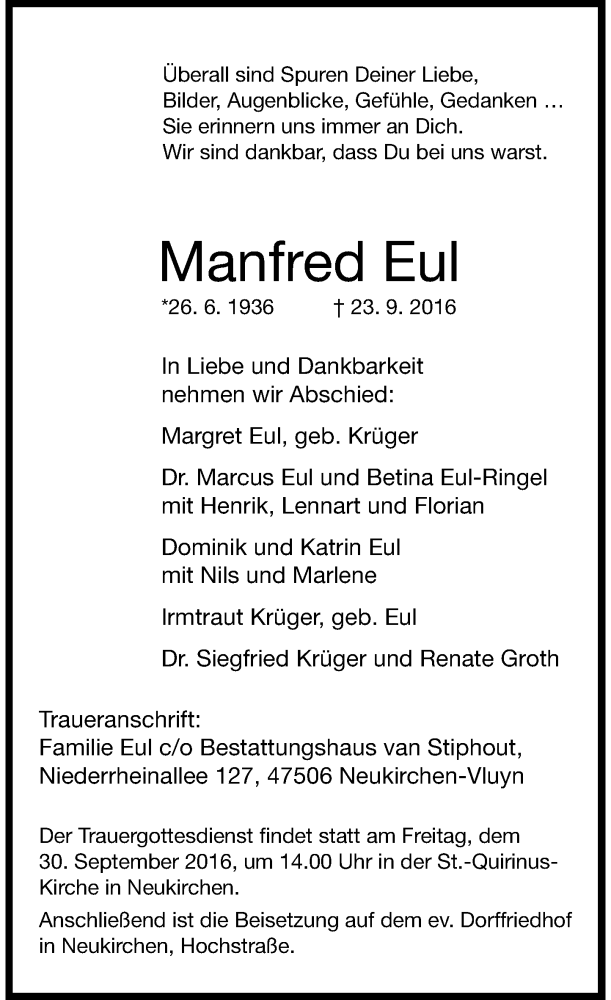 Hier finden Sie alle Traueranzeigen aus der Zeitung, die bisher für Manfred Eul erschienen sind. Weitere Traueranzeigen, die in der Zeitung erscheinen, werden hier ebenfalls aufgelistet