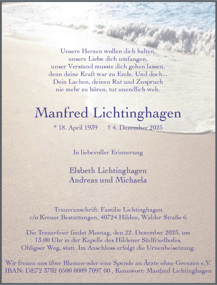 Hier finden Sie alle Traueranzeigen aus der Zeitung, die bisher für Manfred Lichtinghagen erschienen sind. Weitere Traueranzeigen, die in der Zeitung erscheinen, werden hier ebenfalls aufgelistet