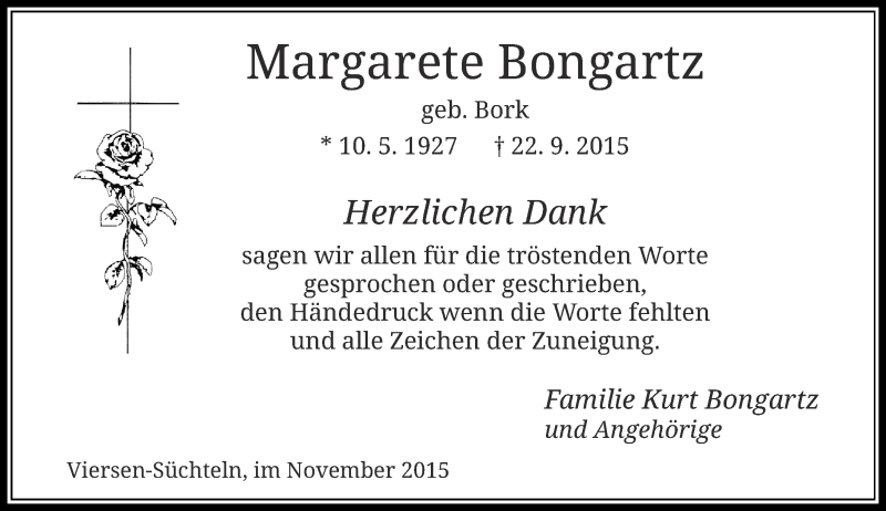 Hier finden Sie alle Traueranzeigen aus der Zeitung, die bisher für Margarete Bongartz erschienen sind. Weitere Traueranzeigen, die in der Zeitung erscheinen, werden hier ebenfalls aufgelistet