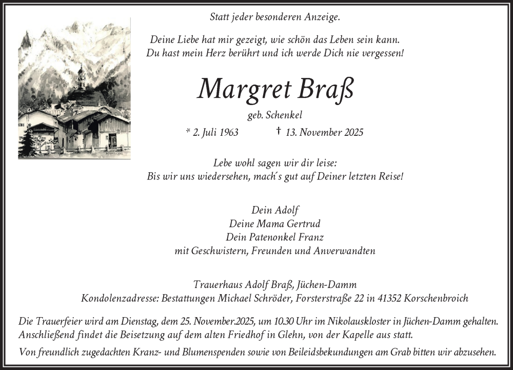 Hier finden Sie alle Traueranzeigen aus der Zeitung, die bisher für Margret Braß erschienen sind. Weitere Traueranzeigen, die in der Zeitung erscheinen, werden hier ebenfalls aufgelistet