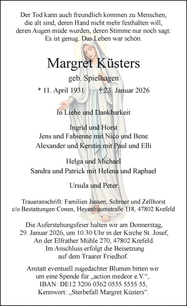 Hier finden Sie alle Traueranzeigen aus der Zeitung, die bisher für Margret Küsters erschienen sind. Weitere Traueranzeigen, die in der Zeitung erscheinen, werden hier ebenfalls aufgelistet