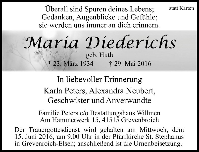 Hier finden Sie alle Traueranzeigen aus der Zeitung, die bisher für Maria Diederichs erschienen sind. Weitere Traueranzeigen, die in der Zeitung erscheinen, werden hier ebenfalls aufgelistet