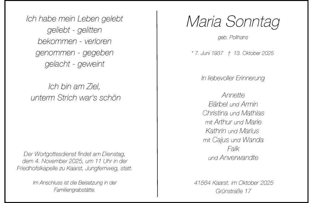 Hier finden Sie alle Traueranzeigen aus der Zeitung, die bisher für Maria Sonntag erschienen sind. Weitere Traueranzeigen, die in der Zeitung erscheinen, werden hier ebenfalls aufgelistet
