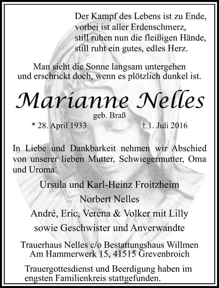 Hier finden Sie alle Traueranzeigen aus der Zeitung, die bisher für Marianne Nelles erschienen sind. Weitere Traueranzeigen, die in der Zeitung erscheinen, werden hier ebenfalls aufgelistet