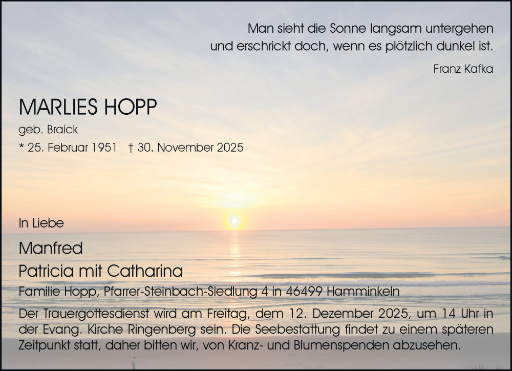 Hier finden Sie alle Traueranzeigen aus der Zeitung, die bisher für Marlies Hopp erschienen sind. Weitere Traueranzeigen, die in der Zeitung erscheinen, werden hier ebenfalls aufgelistet