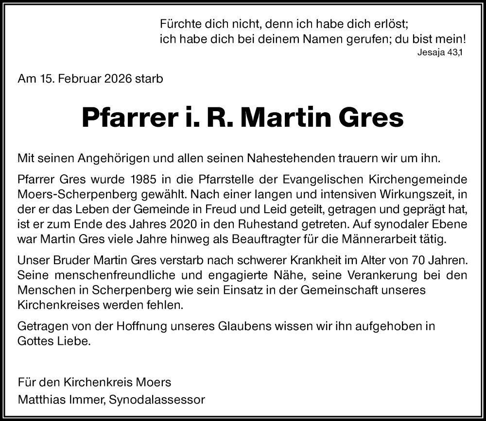 Hier finden Sie alle Traueranzeigen aus der Zeitung, die bisher für Martin Gres erschienen sind. Weitere Traueranzeigen, die in der Zeitung erscheinen, werden hier ebenfalls aufgelistet