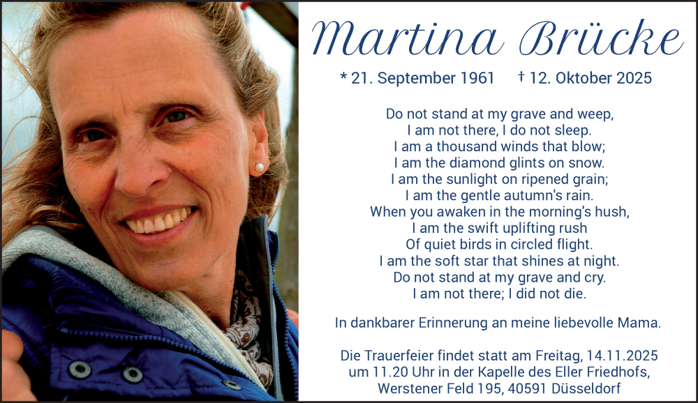 Hier finden Sie alle Traueranzeigen aus der Zeitung, die bisher für Martina Brücke erschienen sind. Weitere Traueranzeigen, die in der Zeitung erscheinen, werden hier ebenfalls aufgelistet