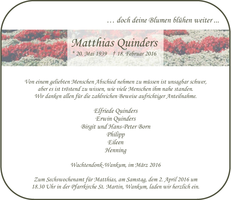 Hier finden Sie alle Traueranzeigen aus der Zeitung, die bisher für Matthias Quinders erschienen sind. Weitere Traueranzeigen, die in der Zeitung erscheinen, werden hier ebenfalls aufgelistet