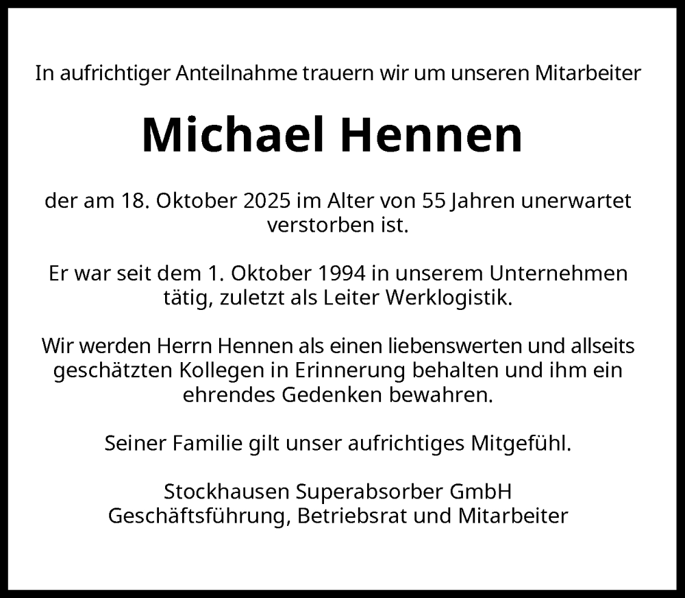 Hier finden Sie alle Traueranzeigen aus der Zeitung, die bisher für Michael Hennen erschienen sind. Weitere Traueranzeigen, die in der Zeitung erscheinen, werden hier ebenfalls aufgelistet