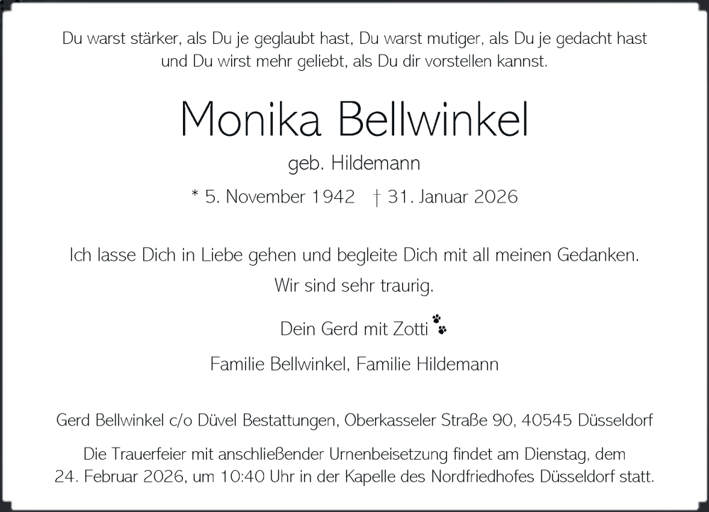 Hier finden Sie alle Traueranzeigen aus der Zeitung, die bisher für Monika Bellwinkel erschienen sind. Weitere Traueranzeigen, die in der Zeitung erscheinen, werden hier ebenfalls aufgelistet