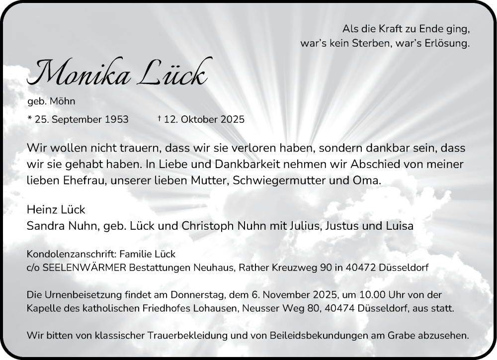 Hier finden Sie alle Traueranzeigen aus der Zeitung, die bisher für Monika Lück erschienen sind. Weitere Traueranzeigen, die in der Zeitung erscheinen, werden hier ebenfalls aufgelistet