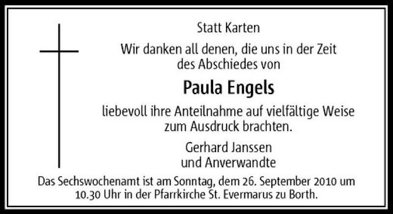 Hier finden Sie alle Traueranzeigen aus der Zeitung, die bisher für Paula Engels erschienen sind. Weitere Traueranzeigen, die in der Zeitung erscheinen, werden hier ebenfalls aufgelistet
